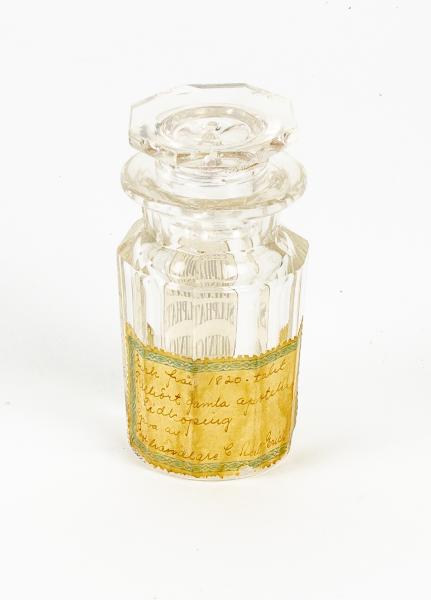 Burk och lock är genomskinliga. Lockets glaspropp är inslipat, för att kunna sluta tätt. Den fastklistrade etiketten, på burkens baksida har texten: BURK FRÅN 1820-TALET. TILLHÖRT GAMLA APOTEKET I LIDKÖPING. GÅVA AV BOKHANDLARE C. AXEL ERICSSON.