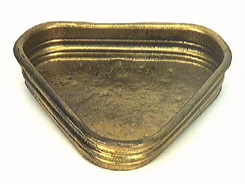 Ett trekantigt fat i plåt, med rundande hörn och upprättstående kanter, med längsgående utbuktningar runtom. Överkanten är rundad utåt.