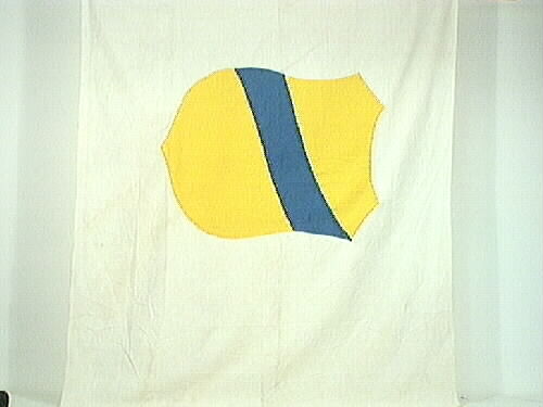 Rederiflagga. Flagga utan angiven tillhörighet. Sydd av bomull vävt i tuskaft, vit med infälld sköld i mitten. Sköldens mittfält är blått, gula sidofält. I överkanten 1960 mm långt rep för upphängning. Repet är trätt genom kraftigt bomullstyg. I den ena änden av repet sitter en lekare.