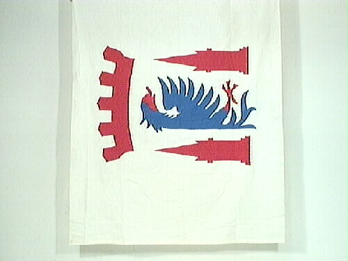 Flagga sydd av bomull vävt i tuskaft. Vit med Karlstads vapen på, en halv örn i blått med röd klo och näbb, på var sida om örnen ett rött torn, över alltsammans en rak röd krona. I överkanten rep med en ögla i den ena änden, lekare i den andra änden, trätt genom kraftigt bomullstyg. Påsytt märke EOS, Flaggfabrik, Ekelöf & Svensson A-B, Karlstad.
