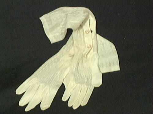 Fingervante, dam, ett par långa, knäpps med två tryckknappar på insidan vid handleden. Mönsterstickade utom på fingrarna. Oblekt silkestråd.