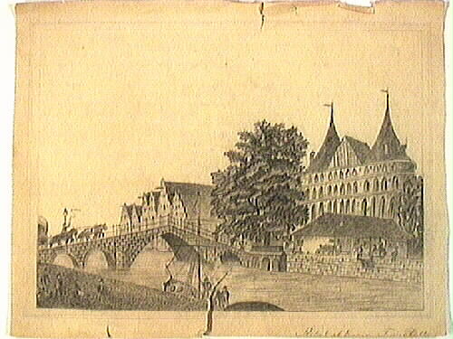 Teckning föreställande en stad. Genom staden rinner en flod och över floden går en bro. På bron är en vagn, som dras av hästar. Vid kajen ligger en båt, sju personer håller på att lasta av eller på båten. På andra sidan floden är flera stora hus och människor.