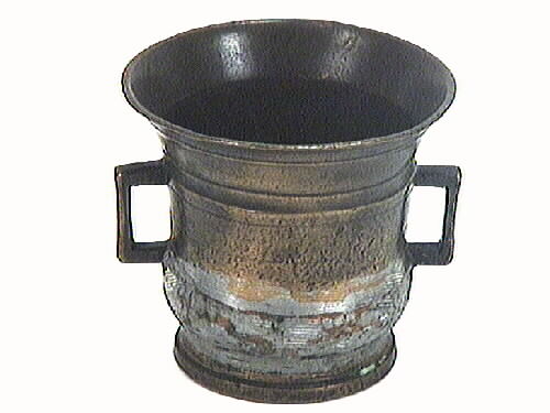 En mortel i malm, med vid mynning och två rektangulära slutna hänklar.