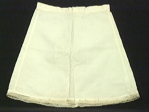 Dockunderkjol sydd av oblekt tuskaftstyg av bomull, tre våder, avslutas nertill med smal spets. Sprund bak med handsytt knapphål och knapp. Fällsömmar i sidorna.