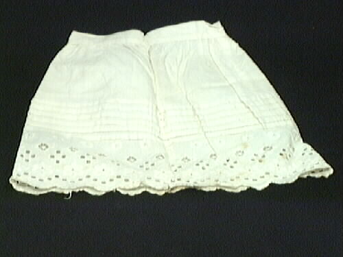 Dockunderkjol sydd av tuskaftstyg i oblekt bomull. Rynkad i midjan. Sydda stråveck, nertill brodyr. Sprund bak, handsytt knapphål, knapp saknas. Linningen endast fasttråcklad. Några rostfläckar. Kan ev. höra till dockan "Svea". Jmf 5M16 - 004202.