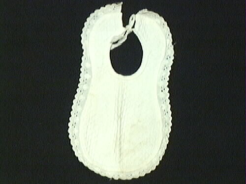 Dockhaklapp sydd av vit pikétyg kantad med brodyr. Halsringning kantad med band som fortsätter ut i knytband i nacken. Kan ev. höra till dockan "Svea" jmf 5M16 - 004202.