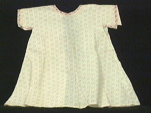 Dockförkläde sytt av tunt tuskaftsvävt tyg med tryckta ringar och prickar i rött på oblekt botten. Sydd i ett stycke med en liten vingärm. Öppen hela vägen bak. Ärmar och hals kantat med mönstervävt band. Kan ev. höra till dockan "Svea" jmf 5M16 - 004202.