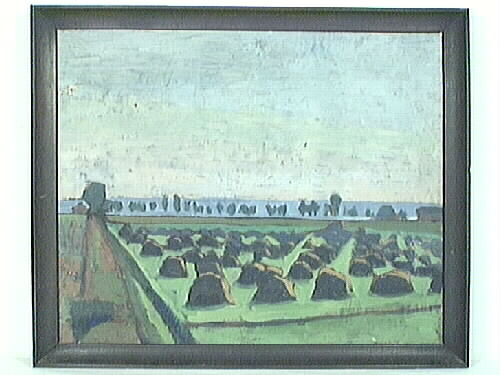 - Oljemålning på duk. Landskap, utsikt över Dättern. I förgrunden hövolmar på grön mark. Alléträd vid strandkanten. Gråblått vatten, ljus himmel. Osignerad. Färgavfall i övre vänstra delen, samt mitt på målningen. Svartlaserad träram. Påskrift på spännramen: "Från Sjöryd" samt "Från 30-talet av Lilly Rydström intygas Folke Wickelberg."