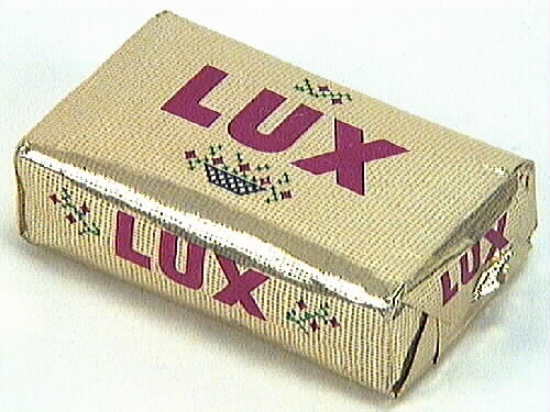 papper med beige rosa stänk. På ovansidan texten: LUX i violett, över och under är små stiliserade blommor och blad. På undersidan står: 9 FILMSTJÄRNOR AV 10 ANVÄNDER LUX TOALETTVÅL, inom en beige oval.