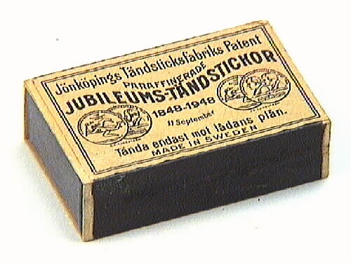 En tändsticksask med stickor, med svart svavel. Två av ytteraskens långsidor är försedda med plån. Ena större sidan har en gul etikett med bilder och svart text: JÖNKÖPINGS TÄNDSTICKSFABRIKS PATENT, PARAFFINERADE JUBILEUMSTÄNDSTICKOR 1848-1948, 11 SEPTEMBER. TÄNDS ENDAST MOT LÅDANS PLÅN. MADE IN SWEDEN.