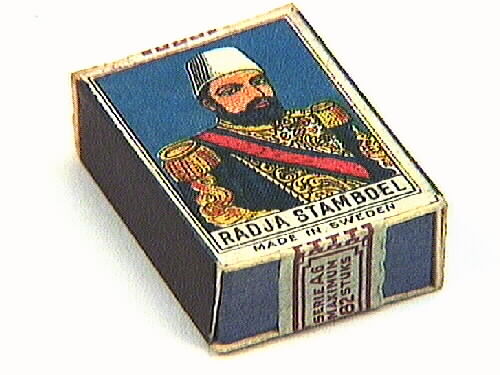 En tändsticksask med stickor, banderollsticka, det vill säga, asken är stängd med en banderoll. Långsidorna är försedda med plåt, en större sida med etikett: Arabisk man i bröstbild, uniforms-