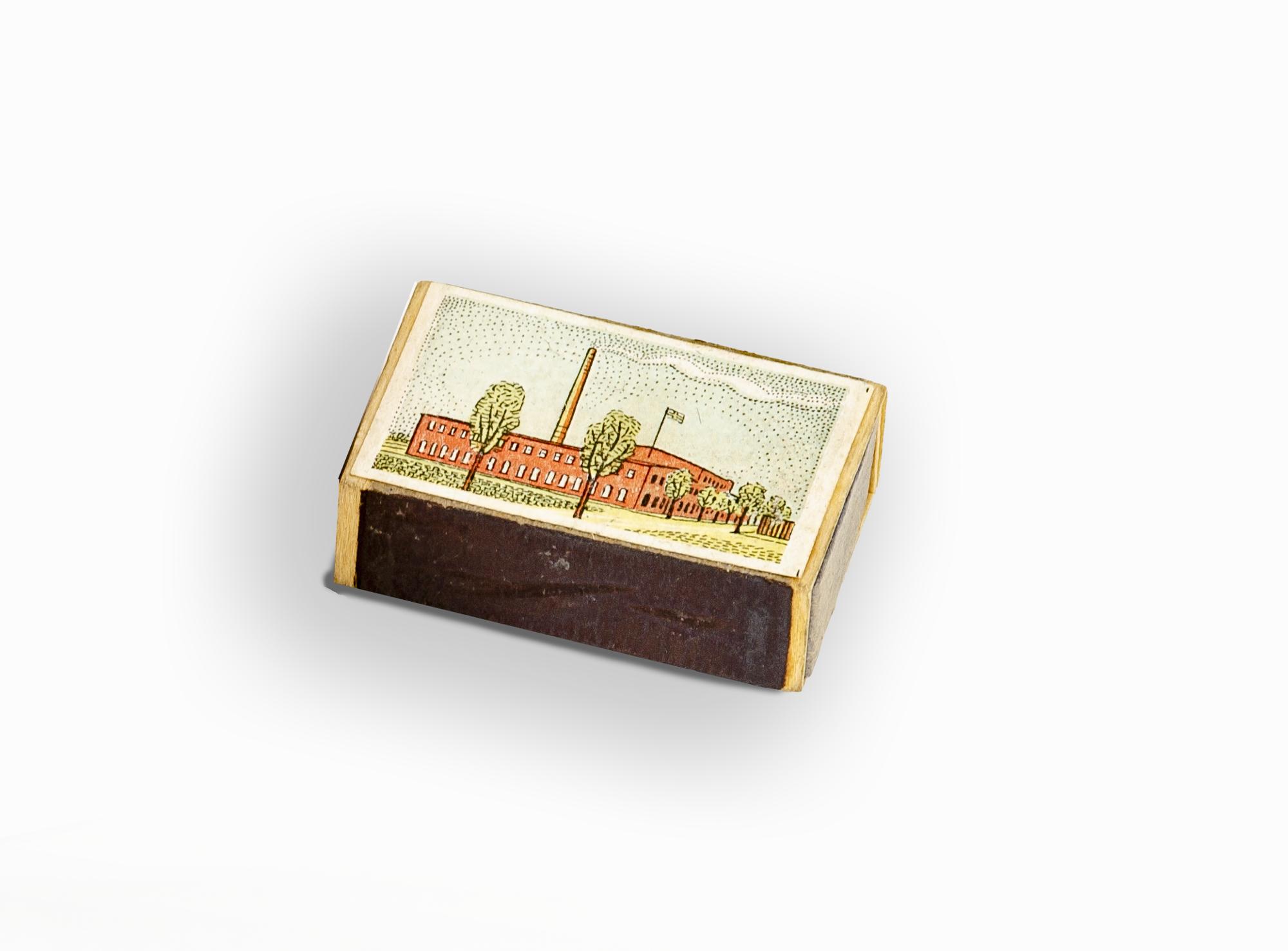En tändsticksask med tändstickor. Det är svart plån på stickorna och på de smalare lång- sidorna. På framsidan är en etikett med en röd fabriksbyggnad, rök ur skorstenen, en flagga, träd och staket. Askens baksida är klädd med blått papper.