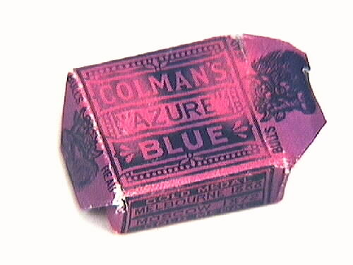 Rosa-violett förpackning med blåelse - används för att få tvätten vit. På förpackningens ovansida står: COLMANS AZURE BLUE och på långsidan står: GOLD MEDAL, MELBOURNE 1888, MOSCOW 1872, GOLD MEDAL. På den andra långsidan: MANUFACTURED BY J & J COLMAN, LIMITED, LONDON, ENGLAND.