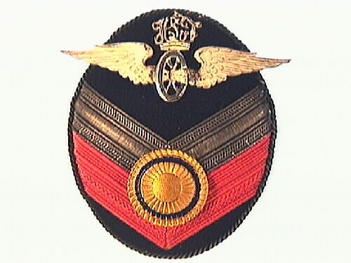 Mössmärke, ovalt, klätt med svart ylletyg, röda och grå V-formade ripsband med hjul av gulmetall. Överst sitter hjul med vingar av vitmetall samt HLJ (Håkantorp Lidköpings Järnväg).