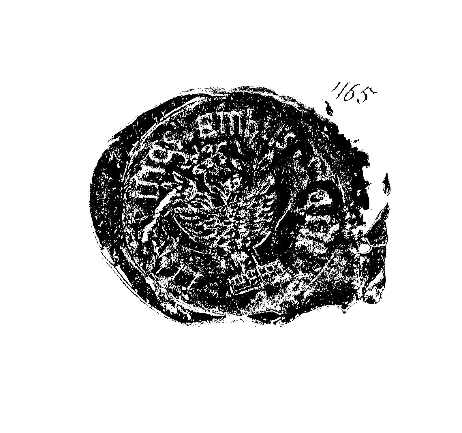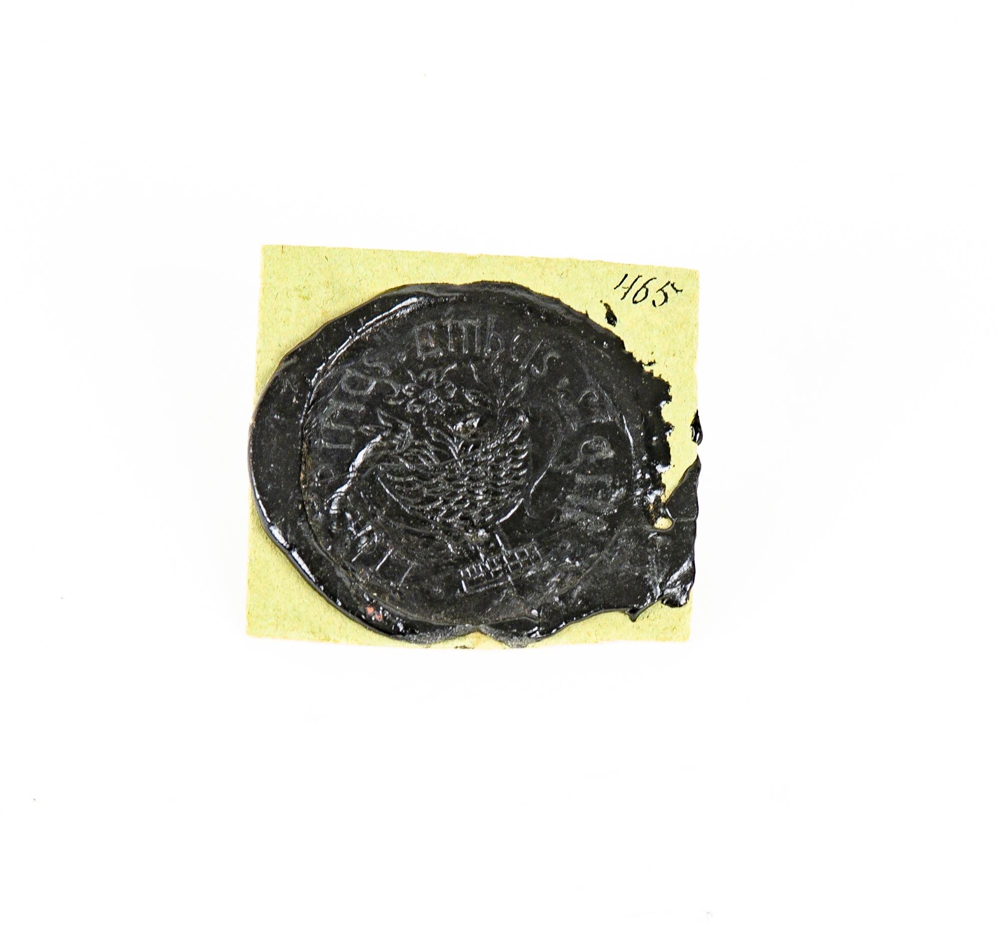 Ett sigillavtryck i svartlack på en pappskiva.