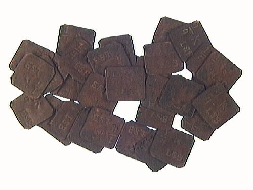 32 stycken kvadratiska polletter med följande stämplar i: