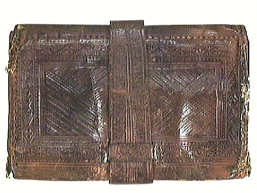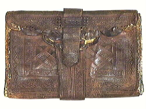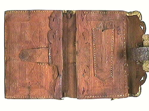 lock. Facken stänges med ett läderband som stoppas in i en hälla.. Rikligt med fack. I ett litet långsmalt fack finns en lapp där det står: PLÅNBOK, med förnämlig läderplastik början 1800-talet. Utanpå plånboken finns ett läderband som man lindar runt plånboken och fäster den i