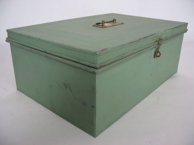 Låda, grönmålad av plåt, med mässingshandtag på locket, relativt klen konstruktion av handtaget. En bygel och en ögla där hänglås används för att kunna låsa lådan.