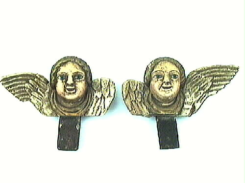 Ornament, änglahuvuden i trä. Vingarna i benvit färg. Hår gulbrunt, ögonen blå med svarta pupiller, röd mun och gulbruna ögonbryn. Halskrage guldfärgad, övermålad, har tidigare