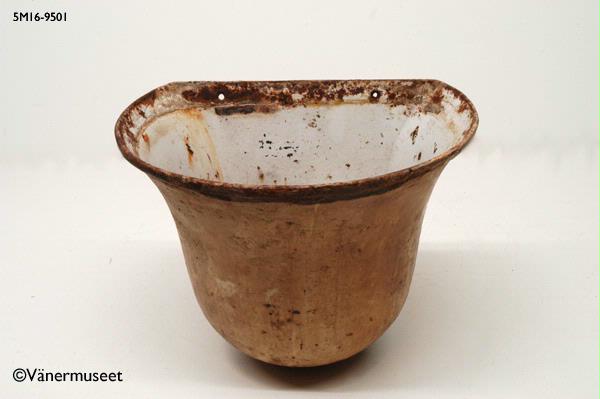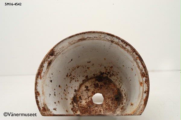 är vitemaljerad, delvis avflagnad och rostig. Löst