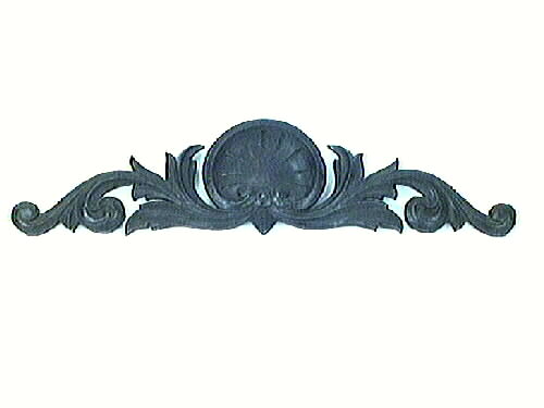 Ornament i trä, svartmålat. Hål i underdelen i ändarna att fästas i. Kan tänkas ha tillhört en