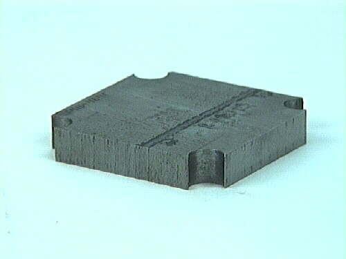 Stål för verktygstillverkning. Fyrsidigt plant stålämne med halvcirkelformade ursågningar i varje hörn. Detta är råmaterial som används vid tillverkning av verktyg för matsilvertillverkning.