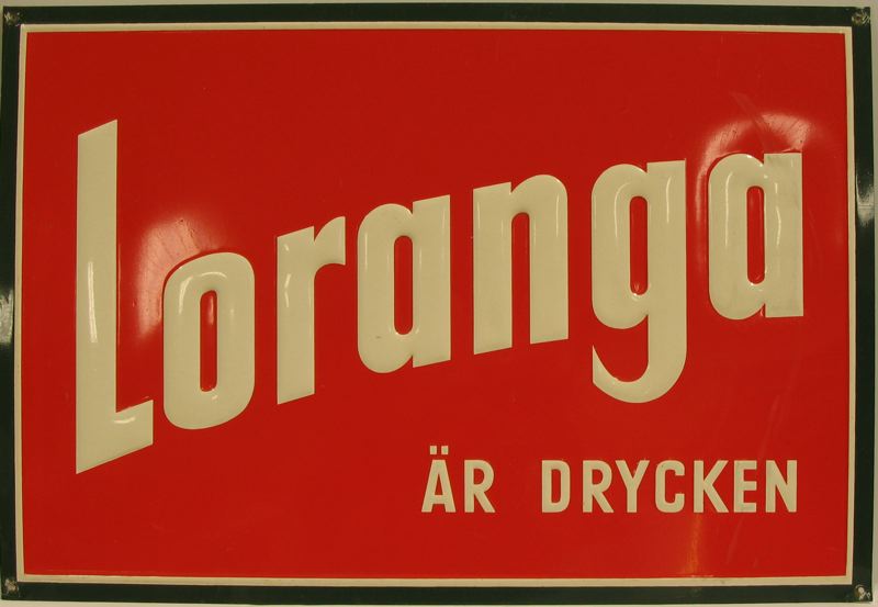 Skylt, läskedrycksreklam. Reklamskylt för lästedrycken Loranga. Rektangulär pressan plåt. Röd bottenfärg med mörkgrön kant ytterst och däremellan en smal vit kant. Mitt på skylten står med vita bokstäver i högrelief: LORANGA. Därunder med något mindre bokstäver: ÄR DRYCKEN. I varje hörn finns ett hål för uppfästning. Skylten fanns i f.d. Nordpolens Mineralvattenfabriks lokal i kvarteret Vesta. Fabriken ägdes av familjen Andrén 1910-1960.