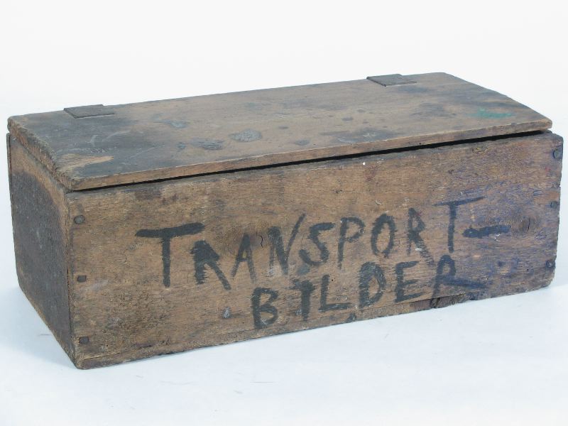 Låda, rektangulär trälåda sammansatt av ohyvlade och en hyvlad bräda. På två långsidor är skrivet: Transportbilder. Locket har gångjärn