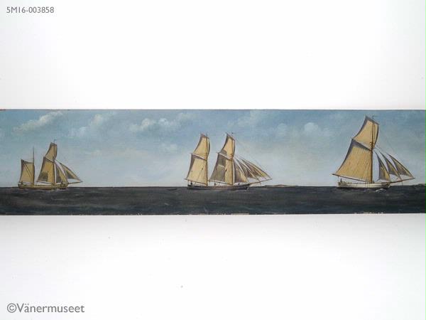Oljemålning, långsmal målning av tre Vänerfartyg, från vänster till höger: galeas, galeas, slup.