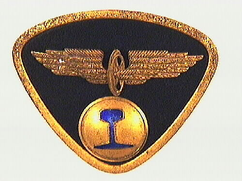 Mössmärke, trekantigt, svart, med förgylld knapp, blå infattning och förgyllda vingar.