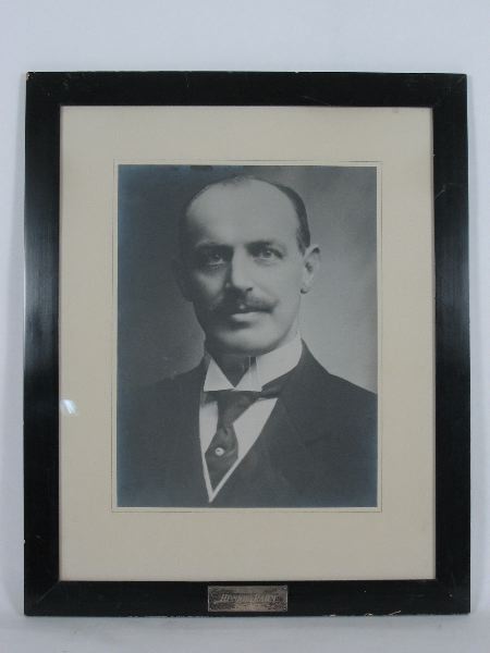 Porträtt med ram, inramat fotografi av direktör Henrik Rahm, direktör för firman Kronsågar 1915-1936. Fabriken grundades 1914. Fotografiet är glasat och har en bred, slät, svartmålad ram med en silverrektangel med följande text: "DIREKTÖR HENRIK RAHM 1915-1936". Silvret är stämplat "SAM" (tillverkaren), "L" (Lidköping), "L8" (året), tre kronor och ett "S".