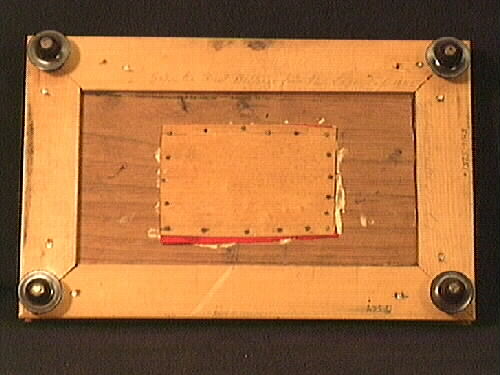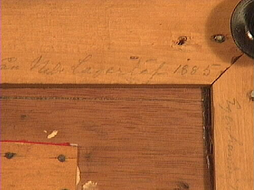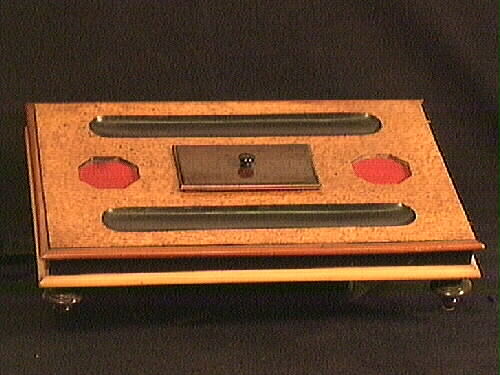 - Skrivställ. Rektangulärt skrivtyg i trä. Profilerade sidostycken, svartmålat i centrum. Fyra svartmålade svarvade fötter. Ovansidan är indelad i fack, två svartmålade för pennor, två för bläckhorn och ett med lock som stämpeldyna. De tre sistnämnda facken är klädda med rött sammetstyg. Ena kortsidans profilerade kant saknas.