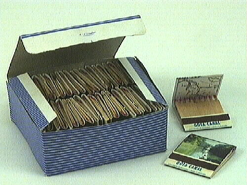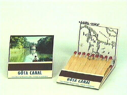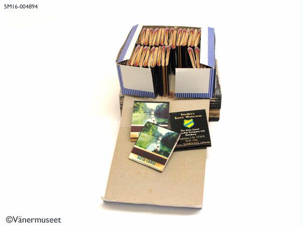 Tändsticksförpackning, med 44 stycken tändsticksbrev. Förpackningen består av en hopfällbar kartongask med blå utsida med vita ränder på, insidan i grå kartongfärg. Tändsticksbrev med 18 tändstickor i två lager. På brevets insida karta över Göta kanal. På nedre sidan står vid plånet: GÖTA CANAL CONTENTS 18 MATCHES - MADE IN SWEDEN. Baksidan är svart med sköld i gult och blått och följande vita text: Sweden's Scenic Waterway The Göta Canal Steamship Company Ltd Göteborg. Hotellplatsen 2 . Tel 177615. TELEX 2284. Concern: Thunbolaget, Lidköping.
