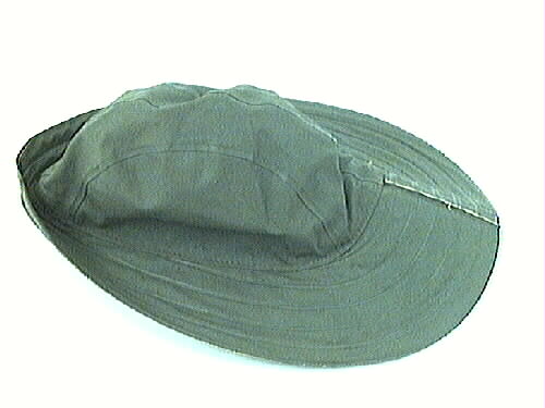 Sydväst, huvudbonad för våtväder. Grågrön plastväv. Brätte runt om, bredare bak. Brättet är stadgat med sammanpressade, klistrade sömmar. Tre klistrade sömmar längsgående över kullen. Under brättet en 50 mm bred kant som skydd för öronen.. Bomullsband för knytning under hakan. Mössan och skyddet är fodrat med bomullstyg. Sydvästen troligen använd av hamn- eller fartygsarbetare.