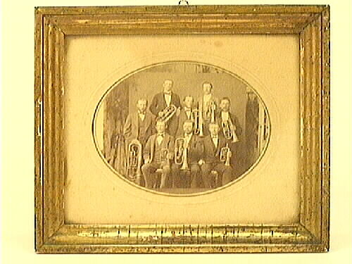 Fotografi med ovalt formad bild. Gruppbild över åtta blåsare. Fotografiets ram är förgylld och 23 mm bred. Bakstycket består av en träplatta. Text på baksidan: "Musikkåren vid Årnäs glasbruk 1870-talet, gåva av fröken Signe Hanson, Lidköping".