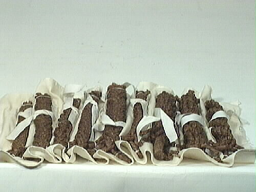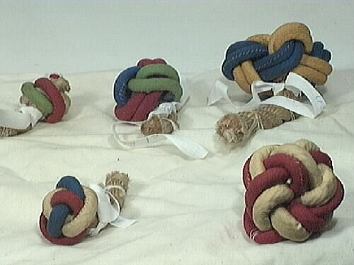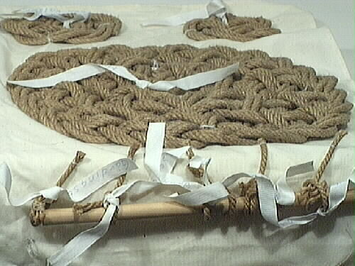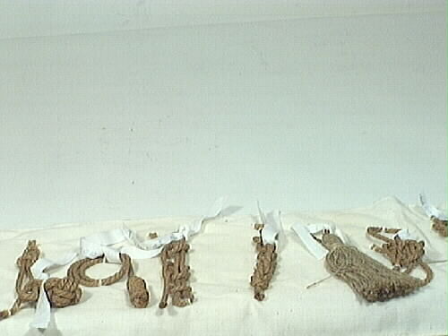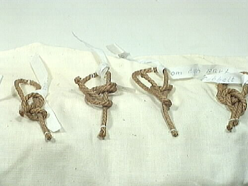 Knopar, 51 olika sorters, uppfästa på fem olika bomullstyg. Den största knopen är 300 mm i diameter och den minsta är 30 mm lång. De olika knoparna är: kärleksknop, enkel pålstek, löpande pålstek, dubbel pålstek, enkelt halvslag om egen part, dubbelt halvslag om egen part, bakvänt halvslag, timmermansstek, grimskaftknop, turkisk säckbandsknop, dubbel nackstek, enkel toppstek, dubbel taljrepsknop, enkel taljrepsknop, krona, enkel stoppknop, dubbel stoppknop, diamant, enkel fallrepsknop, dubbel fallrepsknop, rosenknopp, stjärnan, skruv, kron, rund, halvrund, fyrkantigplatting sexton garns, fyrkantig platting åtta garns, fransk platting, fyrkantig platting åttagarns, vanlig platting femgarns, vanlig platting tregarns, mattrosett av slagen valknop, mattrosett av 3-slagen valknop, en mera konstfärdig mattrosett, enkelt halvslag, dubbelt halvslag, bakhandsknop, läsegelstek, gårdingstek, lusplätting, nackstek, nackstek, trumpet, kastlineknopar, trumpet med krona, kedieknop, svabel, dubbel tuppstek, råbands- eller sjömansknop, käringknop, åttan, engelsman, enkel skotstek, skotstek med rundtörn, skotstek med ögla.
