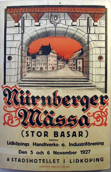 Affisch angående en mässa och basar på stadshotellet i Lidköping. Affischens bild föreställer en murportal i förgrunden och i bakgrunden kan man se delar av en medeltida stad i färgerna rött, grått och svart. Nedanför bilden svart och rödsvart text på vit bakgrund: "Nürnberger Mässa (STOR BASAR) håller Lidköpings Hantverks & Industriförening. Den 5 och 6 November 1927, å STADSHOTELLET I LIDKÖPING OBS". Datum 5 och 6 november 1927 är särskilt påklistrade på affischen. Längst ner står det att affischen är tryckt 1918. Förmodligen har det varit två likadana utställningar 1918 och 1927.
