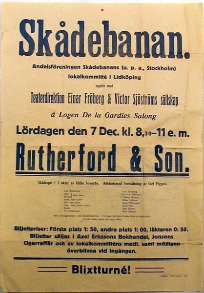 Affisch angående teaterföreställning: "Skådebanan, Andelsföreningen Skådebanans (u.p.a. Stockholm) lokalkommitté i Lidköping uppför med Teaterdrvektion Einar Fröberg & Victor Sjöströms sällskap 'Rutherford & Son' Lördagen den 7 Dec kl 18,30 - 11 em". Affischen är lagad med japanpapper och Hernialim, Hernicoll nr 4738.