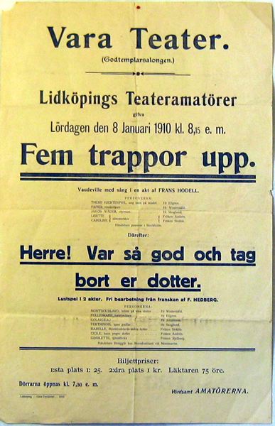 Affisch angående två teaterföreställningar. "Vara Teater. Lidköpings teateramatörer ger 'Fem trappor upp' och 'Herre! Var så god och ta bort er dotter!' Lördagen den 8 Januari 1910 kl 8,15 em".