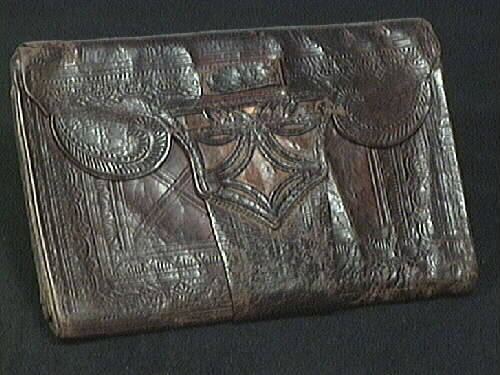 Plånbok i läder som tillhört kakelugnsmakaren och åldermannen Johan Herngren, död i Lidköping 1848 (enligt lapp i plånboken). Lädret är skuret och pressat i mönster. På vissa delar av plånboken är fastsytt dekorativa läderbitar, som även dessa är mönstrade. Plånboken är uppvikbar och när den inte används viks den ihop och hålls samman av en läderrem ca 250 mm lång. Plånboken har fyra fack för sedlar och ett mindre för mynt.