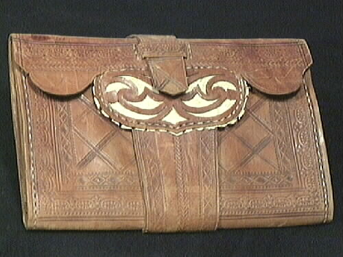 Plånbok i kalvskinn med utskurna och pressade dekorationer. På vissa delar finns ljusare skinn som är hopsytt med det mörkare som är utskuret i mönster. Plånboken är uppvikbar och när den inte används, viks den ihop och hålls samman av en läderrem, ca 250 mm lång. Plånboken har fyra fack för sedlar och ett mindre för mynt.