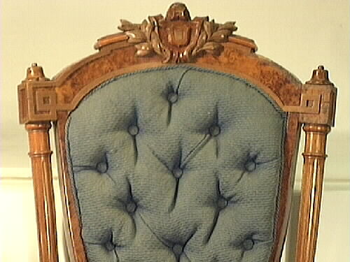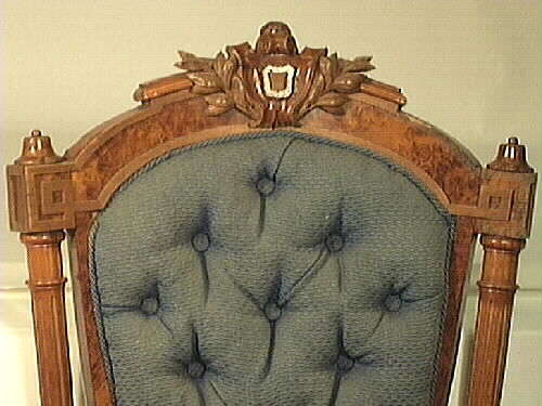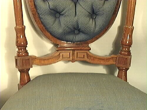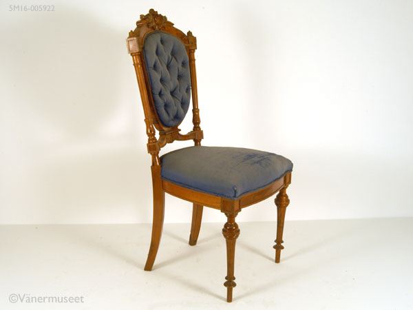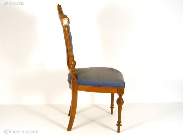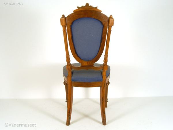 - Stol med fyra ben, stoppad rygg och sits. Bakre benen är fyrkantiga, något svängda. De främre benen profilsvarvade, runda. Ryggstödet är stoppat och har 14 knappar i stoppningen. Den sköldformade mittdelen omges av en pelare på var sida. Krönes med ett parti i trä med ornament på toppen i form av en liten sköld, omgiven av utskurna blad. Stolen är klädd med blått mönstervävt ylletyg. Tyget slitet med bristningar i sitsen. En liten list borta ur krönpartiet.