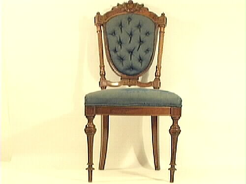 Stol med fyra ben, stoppad rygg och sits. Bakre benen är fyrkantiga, något svängda. De främre benen profilsvarvade, runda. Ryggstödet är stoppat och har 14 knappar i stoppningen. Den sköldformade mittdelen omges av en pelare på var sida. Krönes med ett parti i trä med ornament på toppen i form av en liten sköld, omgiven av utskurna blad. Stolen är klädd med blått mönstervävt ylletyg. Tyget slitet med bristningar i sitsen. En liten list borta ur krönpartiet.