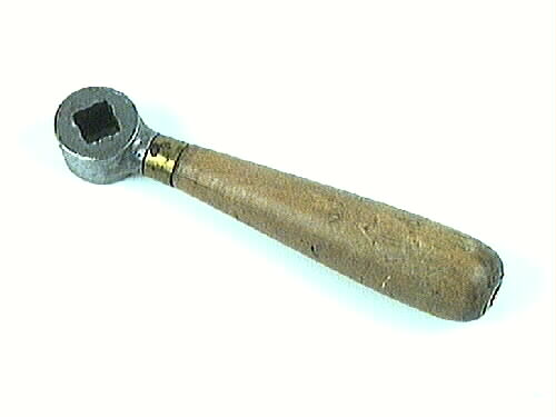 Ventilnyckel med trähandtag. Huvudet har ett rektangulärt genomgående uttag för skruv med fyrkantigt huvud. Eller för brodd. Mellan huvudet och skaftet sitter en ring av mässing.