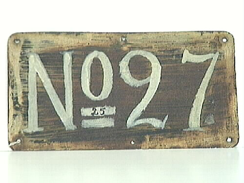 Tomtnummerskylt med text "No 27". Sex hål för upphängning. Färgen avflagnad och skylten bucklig.