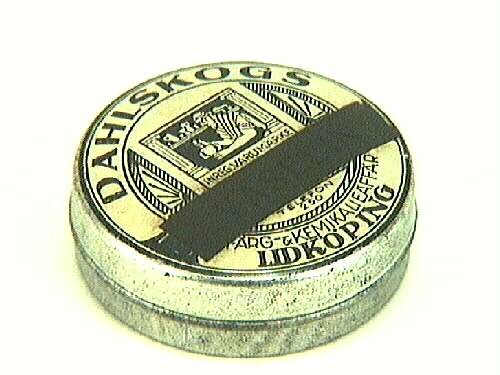 - Vaselinburk med vaselin. Rund burk. Ovansidan är vit med svart tryck "DAHLSKOGS FÄRG & KEMIKALIEAFFÄR, LIDKÖPING" i cirkel. I mitten finns en bild på en kemist som stöter i en mortel och texten "INREG. VARUMÄRKE, TELEFON 250". Över är en lapp klistrad med texten "VASELIN". Burken låg bland skolmaterial på Kylanderskolans vind.