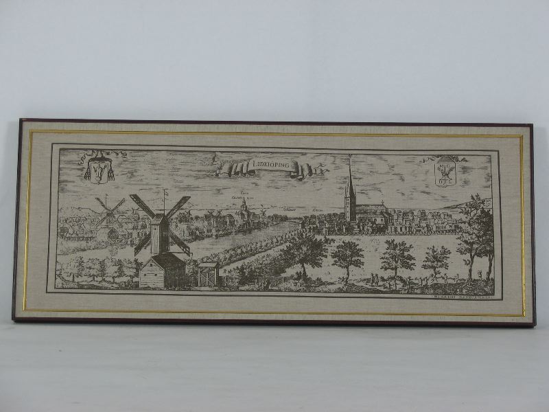 Stadsbild med ram. Bild av Lidköping, reproduktionstryck (handtryckt) från Svecia Antiqua et Hodierna av Erik Dahlberg. Bilden är upptryckt i 28 exemplar för att delas ut som present av kommunen. Detta ex är nr 26/28. Brunt tryck på beige linneväv. Brun ram med guldlist mot duken. På baksidan finns en lapp med texten: "Originalet till detta tryck återfinns i Svecia Antiqua et Hodierna (det gamla och den dåvarande nutidens Sverige) ett samlat bildverk av Erik Dahlberg (1625-1703). LIDKÖPING fanns redan under medeltiden och fick sina första stadsprivilegier år 1446. Staden ödelades av eld år 1553, under konung Gustaf I:s tid. Fältherren greve JAKOB DE LA GARDIE fick år 1613 grevskapet LÄCKÖ med rätt att inom detsamma anlägga en stad och år 1651 förenades Lidköping med grevskapet. År 1665 skildes staden från grevskapet och år 1670 gavs stadsprivilegier för den nya staden. "CURIA CIVITAS NOVA" (nya rådhuset) är ett av greve Magnus Gabriel de la Gardie ditflyttat f d jaktslott. Kyrkan härstammar från medeltiden, restaurerades förra hälften av 1600-talet och förstördes år 1848 av eldsvåda. Den gamla stadens sigill förde bilden av biskop den helige Nicolaus. En annan sköld innehåller den de la Gardieska stadens märke. Originalet graverades år 1697.