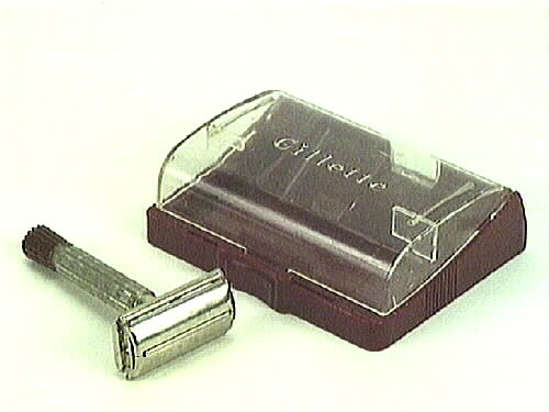 Etui av plast, höjd 36 mm, längd 106 mm, bredd 84 mm. Botten av vinröd räfflad plast med markerad nedsänkt plats för rakhyveln. Genomskinligt lock med texten "Gillette". Under står "MADE IN ENGLAND" och "Gillette".