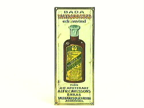 - Reklamskylt som suttit i Varmbadhuset, med reklam för tallbarrsolja. Skylten har guldfärgad kant, brun flaska i relief på vit botten. På gul etikett på flaskan står: "AB Apotekare ALFR. CARLSSONS ENKAS TALLBARS-OLJEFABRIK. JÖNKÖPING; ÄKTA TALLBARRSOLJA; AETEROLEUM PINI SILVE - STRIS SUECIC VERUM 'CARLSSON' i förhållande till hudens känslighet eller den hudretning man vill åstadkomma tages 1 à 2 theskedar till hvarje bad. Inregistreradt Fabriksmärke". Över flaskan står: "BADA TALLBARRSBAD" och "använd" i rött och grönt. Under flaskan står: "FRÅN A:B APOTEKARE ALFR CARLSSONS ENKAS TALLBARRSOLJEFABRIK, JÖNKÖPING". Fram till 1970 beställde man tallbarrsolja från fabriken till Varmbadhuset. Givaren var kassörska på badhuset.