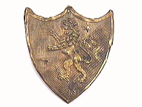 Ett märke till uniformsmössa från Västgöta regemente. Märket är i mässing och har formen av en sköld. på skölden är avbildat ett lejon som står på bakbenen. Lejonet har två svansar.